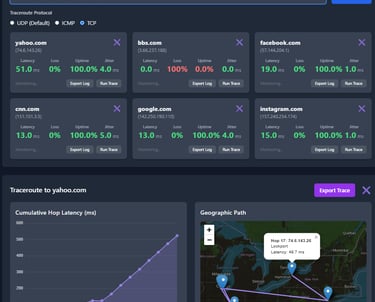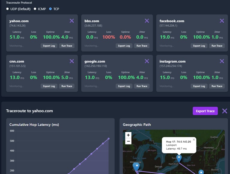 Trace and map your path with "NetEye." Tracking jitter, packet loss, stability, and route performance in real time. Quickly pinpoint failures, ISP issues, and bottlenecks with clear, actionable diagnostic data.