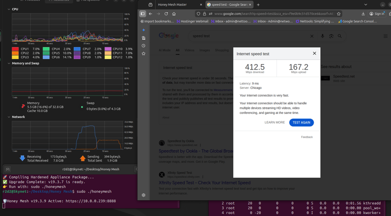 Honeymesh-Specific: In simulated attacks (1Gbps scans), <10% single-core CPU, <100MB RAM peak—scalable to 10Gbps on mid-tier servers.